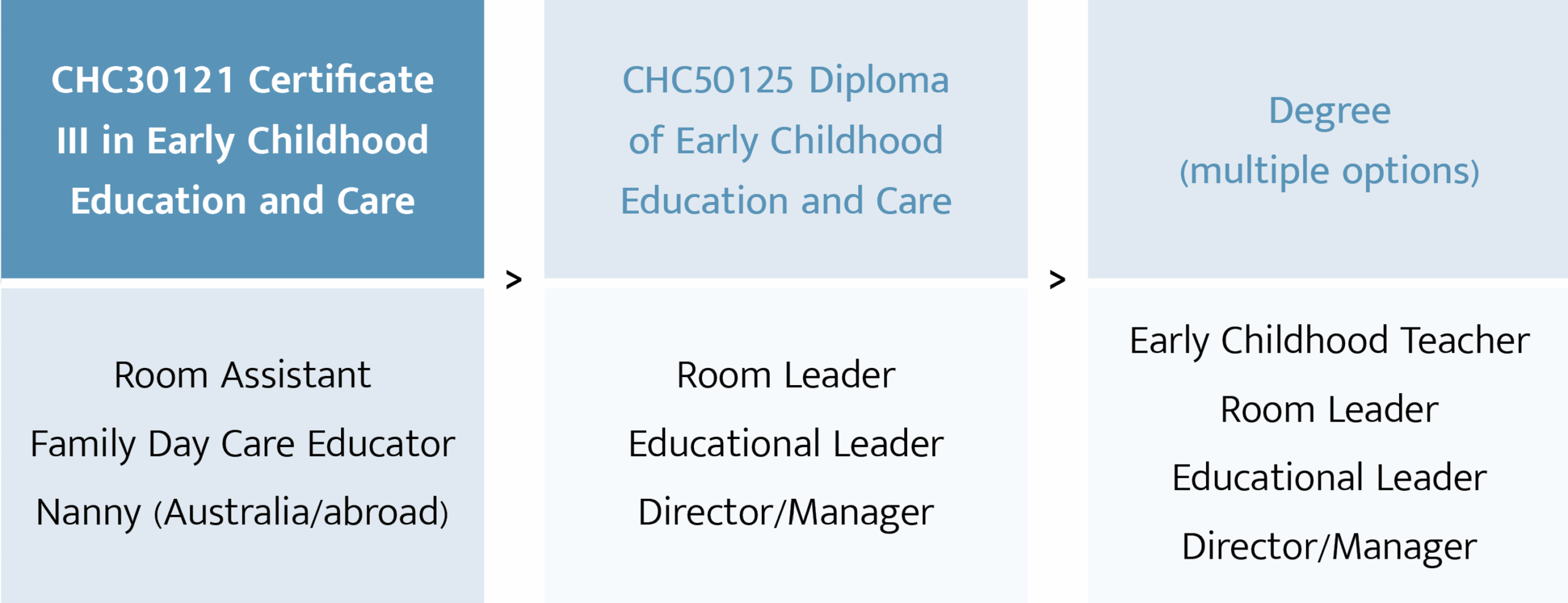 Upon successful completion of your SBAT Program, you will be a qualified Certificate III Level Early Childhood Educator. From there you could set your sights on climbing the ranks of Early Childhood, building professional experience and gaining further qualifications such as CHC50125 Diploma of Early Childhood Education and Care.